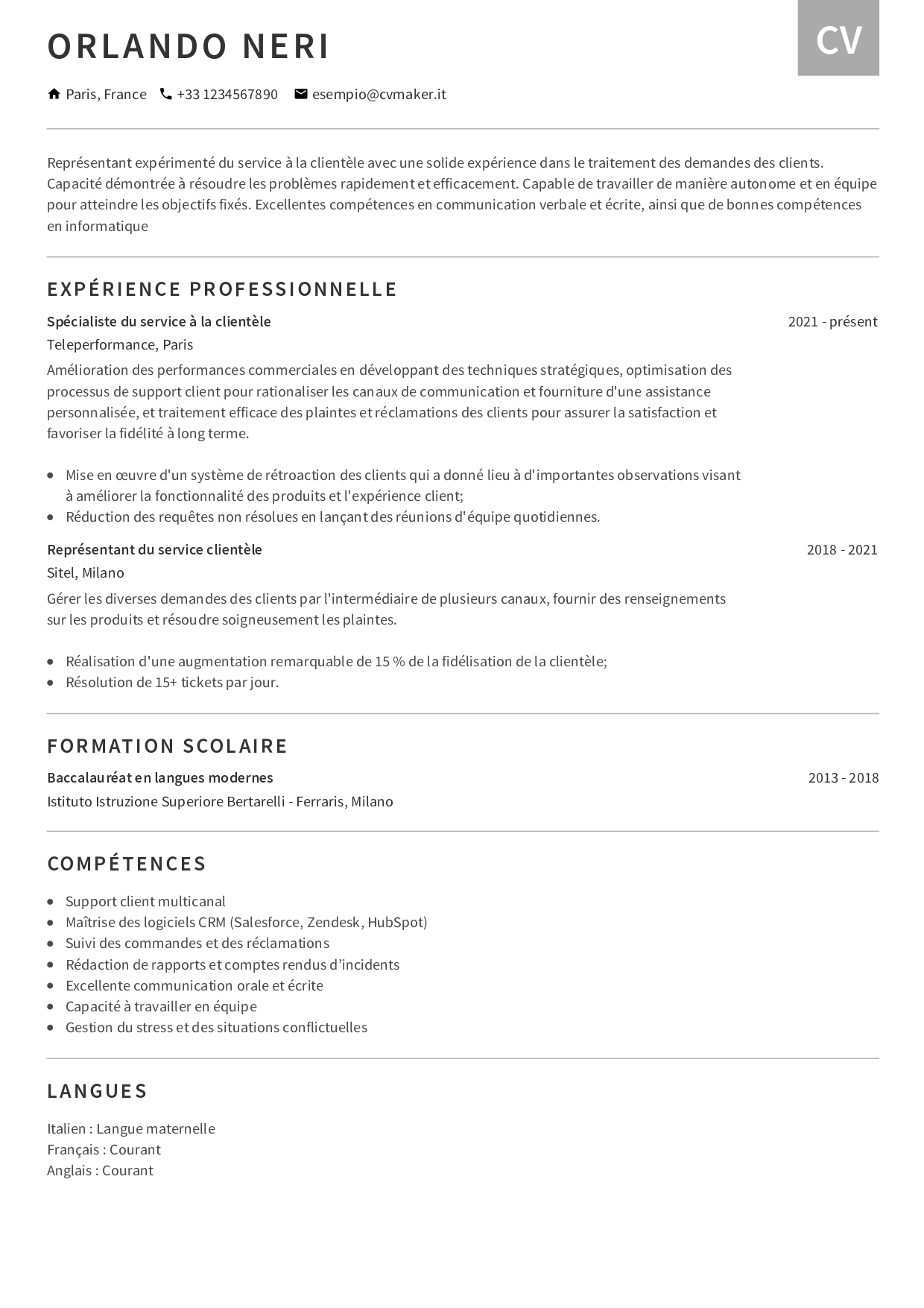 Se hai bisogno di aiuto per scrivere il tuo curriculum in francese, sei nel posto giusto! Con il nostro CV Builder intuitivo puoi scegliere tra numerosi modelli di curriculum vitae professionali già formattati. Scegli il modello di CV in francese che preferisci, inserisci le tue informazioni e scarica il tuo CV in pochi minuti, pronto per essere inviato ai recruiter. Inoltre, sul nostro blog troverai tante guide pratiche e consigli utili per affrontare la ricerca di lavoro con maggiore sicurezza e aumentare le tue possibilità di ottenere un colloquio.