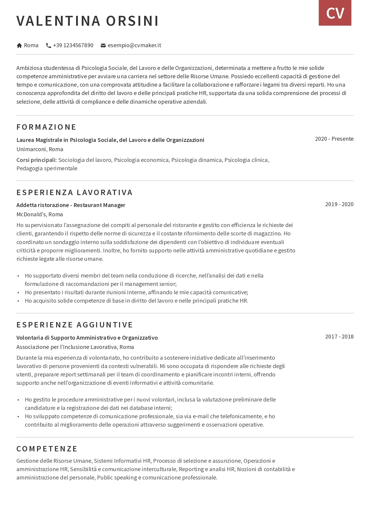 In questo esempio di CV per studenti presentiamo Valentina, studentessa universitaria al quinto anno che desidera iniziare la propria carriera nel settore delle Risorse Umane. Ha scelto un formato a colonna singola e un modello di CV semplice, perfetto per mettere in evidenza le informazioni essenziali.